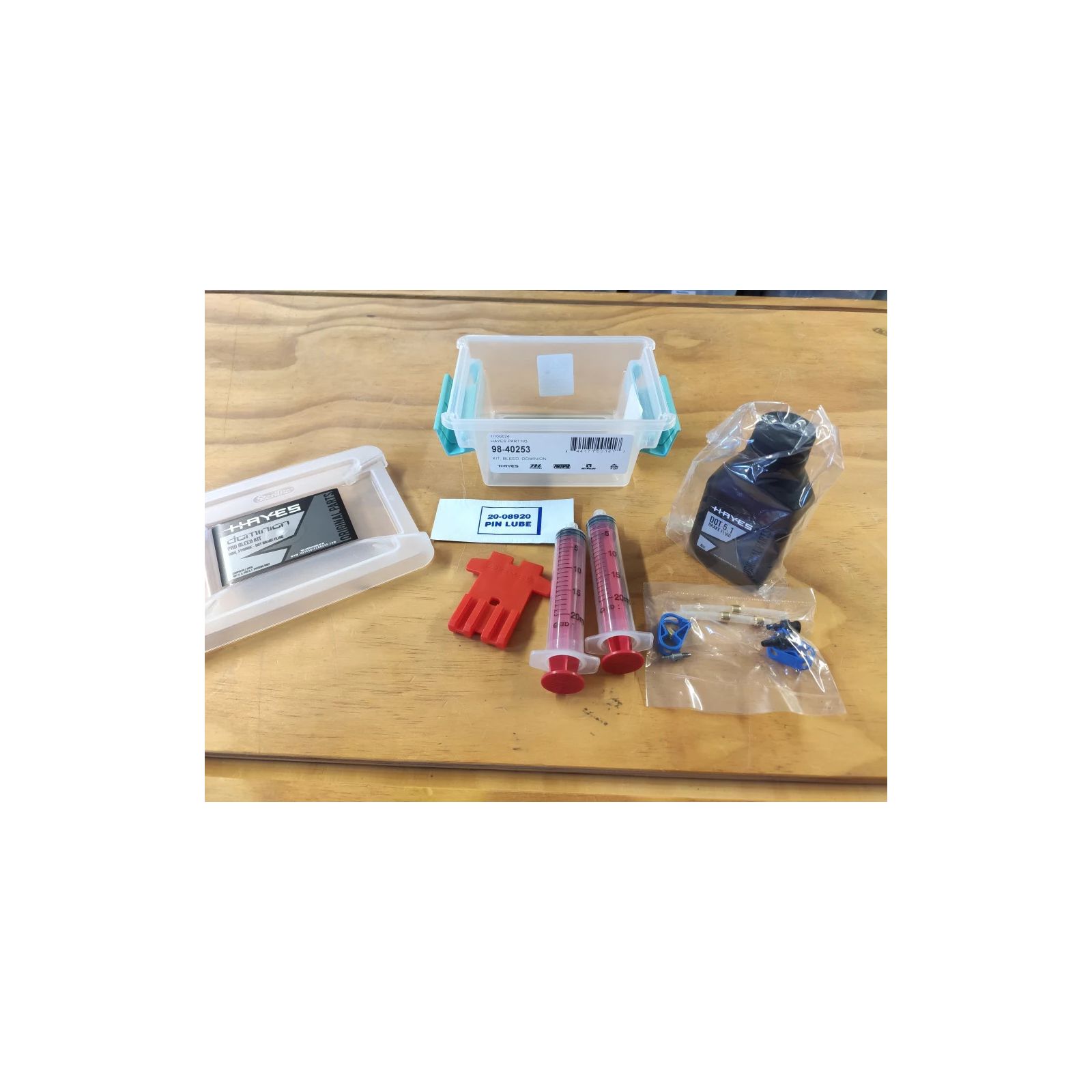 Le kit de purge Hayes Dominion est dédié à la purge des freins Hayes Dominion A2, A4, T2 et T4. Composé de deux seringues avec leur raccords, d'une cale permettant de bloquer les pistons d'étrier pendant la purge et d'un flacon de liquide de frein DOT 5.1 de 59 ml, le kit de purge Hayes Dominion est livré dans une boîte de rangement de qualité. Le flacon de DOT 5.1 de 59 ml livré avec le kit de purge Hayes Dominion permet d'effectuer une à deux purges. Le liquide de frein Hayes DOT 4 et 5.1 est également proposé séparément. Pour la purge des modèles de frein antérieurs au frein Hayes Dominion, le kit de purge Hayes Dominion peut être complété avec les raccords de purge Hayes Legacy.